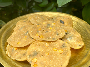 Thattai is a uniquely south Indian snack that is not very well-known north of the Vindyas. Using a base of traditional rice flour, Girija Paati’s Thattai is a complete meal on its own, with proteins from bengal gram & channa dhal, protective vitamins from the curry leaves and the subtle flavour of white sesame seeds, all of which are balanced out by the digestive powers of asafoetida.