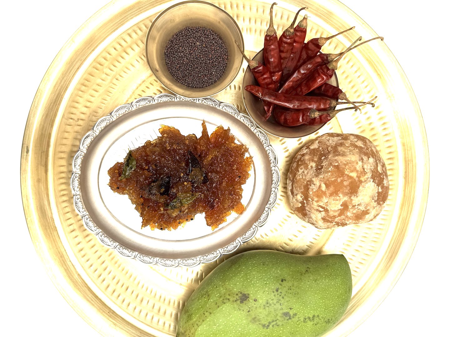 Raw mango, Jaggery, Red chillies, Mustard, Peanut oil, Salt, Curry leaves